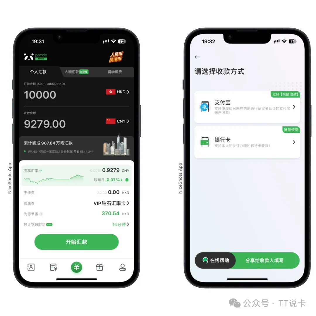 输入汇款金额后点击开始汇款,目前熊猫速汇支持支付宝银行卡收款两种方式 pic